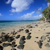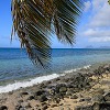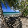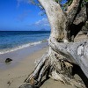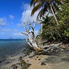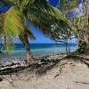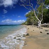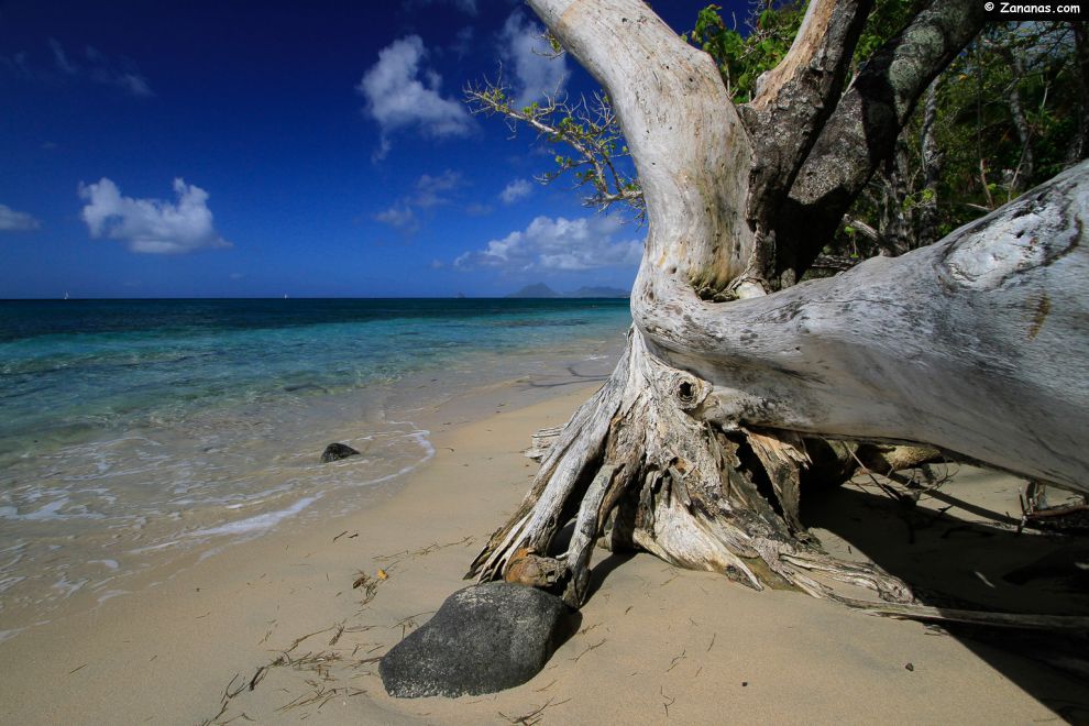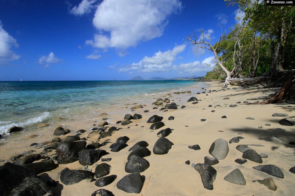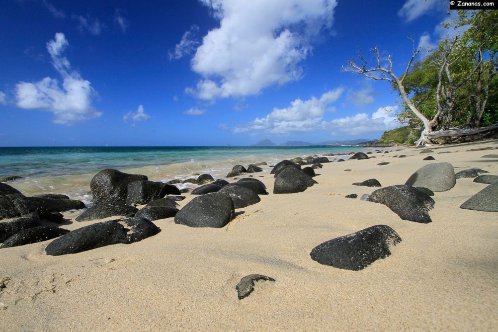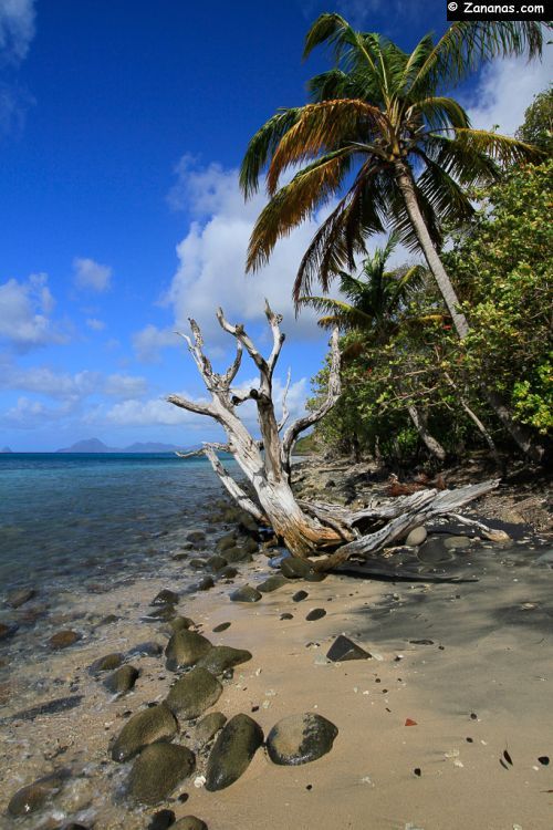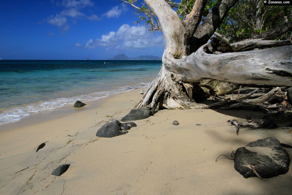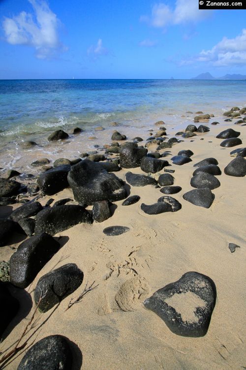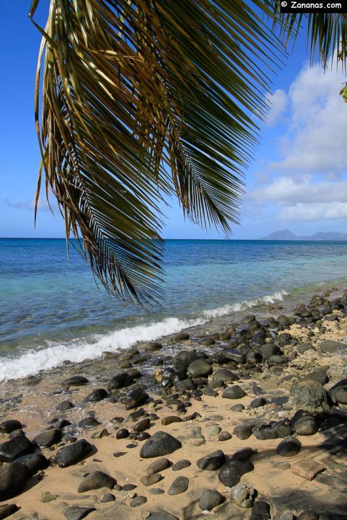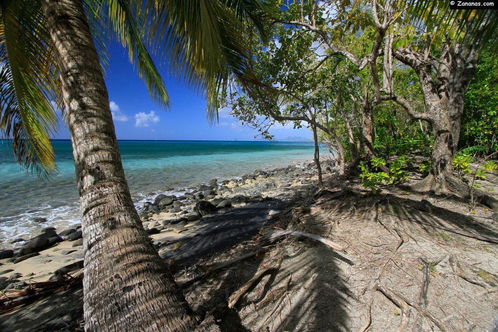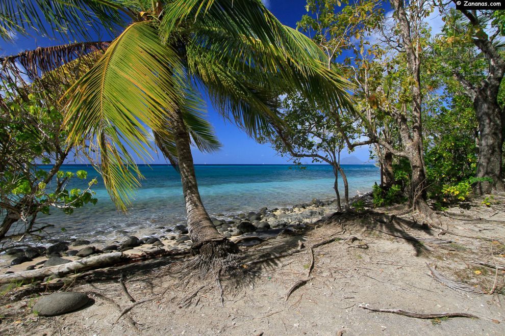 Du parking, un sentier de chèvre caillouteux dévale en serpentant vers une longue bande de sable blond assez étroite, bordée d’arbres et de quelques cocotiers.